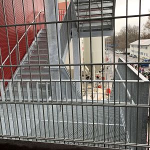 Als Fluchttreppe fungiert eine außenliegende Stahltreppe, welche das Gebäude, mit seiner technisch wirkenden und rostrot lackierten Lochfassade, gestalterisch ergänzt.