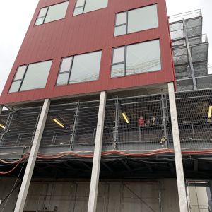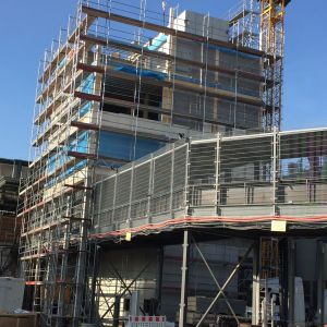 Die Tragkonstruktion des überhohen Erdgeschosses umbaut den vorhandenen Stahlsteg. Dies erfordert ca. 10 m hohe Fassadenstützen, welche aus Montagegründen als schlanke Fertigteile hergestellt wurden. Die Decken und Außenwände wurden als rückbaufähige Stahl-Holz-Ständerkonstruktion konzipiert und sind zur Aussteifung an den, auch für Erdbebenlasten gerechneten, Treppenhauskern angebunden.
