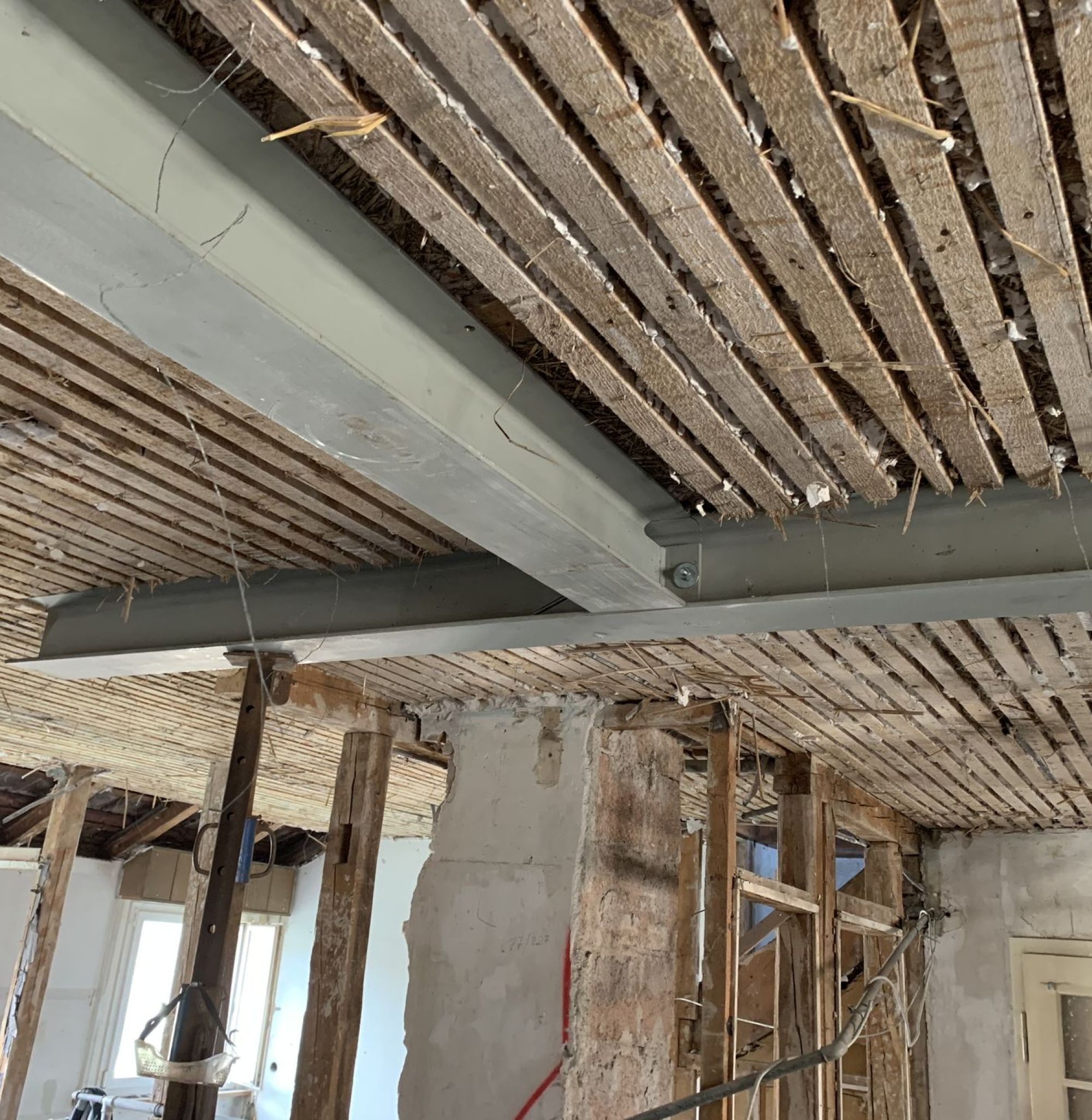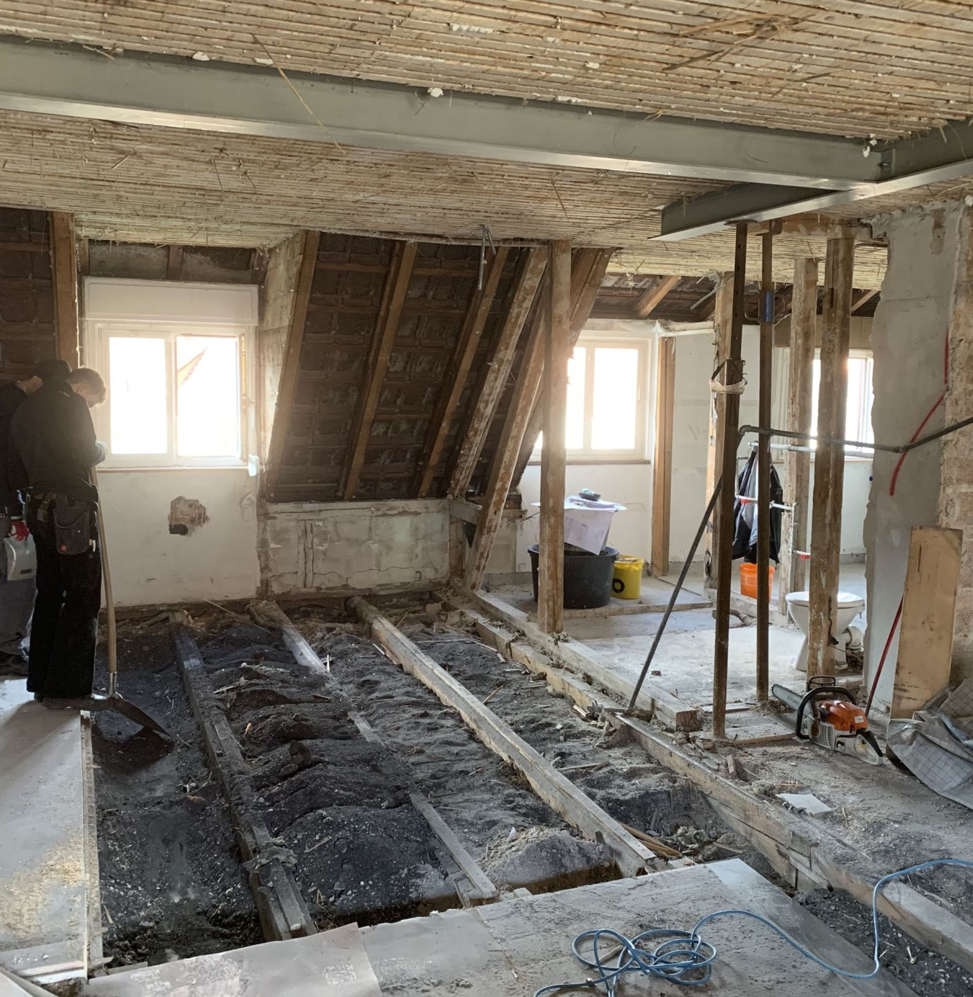 In dem 1948 errichteten Wohngebäude wird das bisher nicht genutzte 2. Dachgeschoss (Spitzboden) und das 1. Dachgeschoss aus- und umgebaut. Die vorhandene Dachkonstruktion soll dabei nicht ersetzt, sondern nur ergänzt werden. Bedingt durch die höheren Nutzlasten im 2. Dachgeschoss (DG) sowie die geplante Dachterrasse im 1. DG sind bereichsweise Tragwerksertüchtigungen in Holz und im Bereich abzufangender Dachstützen mittels Stahlträger erforderlich.