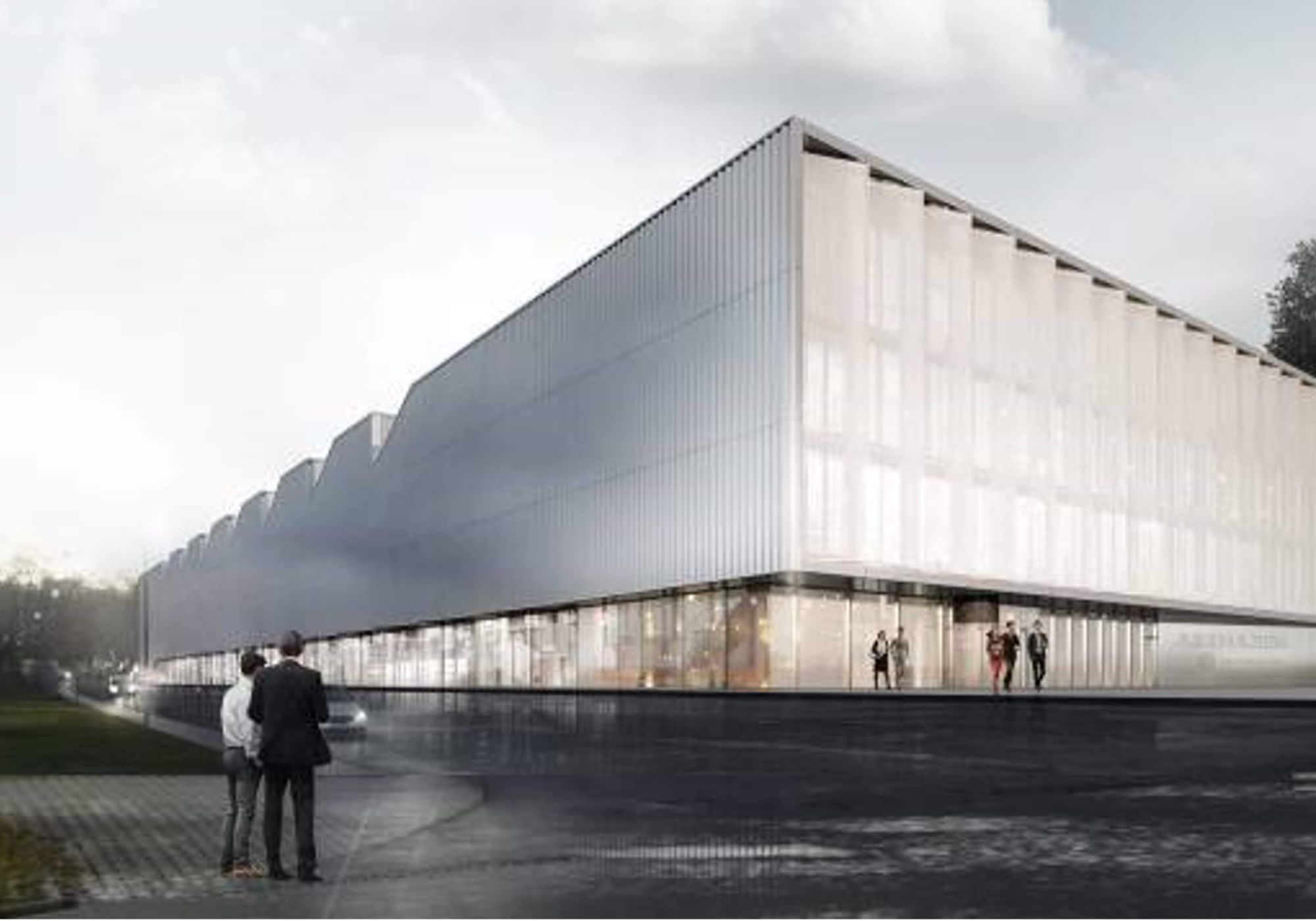 Sie besteht aus einer Produktionshalle mit stützenfreiem Grundriss von ca. 120 m x 40 m und einem viergeschossigen Bürotrakt, der am Kopfende der Halle angeordnet ist.
