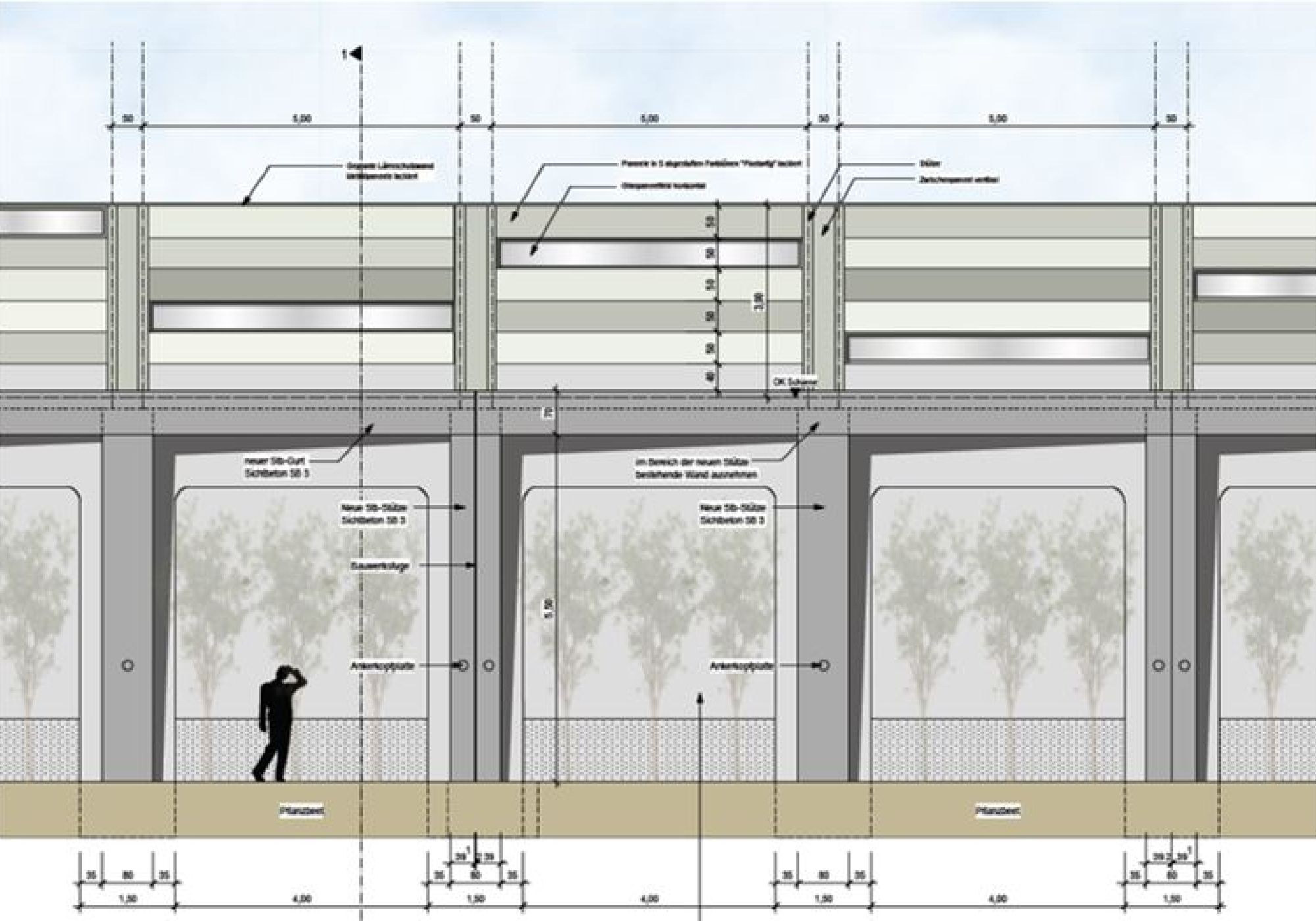 Entlang der Bahnstrecke Stuttgart-Esslingen entsteht in Stuttgart Bad Cannstatt ein neuer Stadtteil, der Neckarpark.Die Bahnlinie liegt auf einem Damm, der bis zu 6,5m über dem Stadtteil liegt und der von einer Schwergewichtsmauer aus Stampfbeton bzw. einer Böschung begrenzt wird. Um den erforderlichen Abstand zwischen Lärmschutzwand und Bahn zu erreichen und um die Lasten der Lärmschutzwand besser aufnehmen zu können wird vor der bestehenden Schwergewichtswand eine Rahmenkonstruktion aus Stahlbeton gebaut, die mit Ankern gegen den Untergrund verspannt wird. Auf ihr wird eine Lärmschutzwand aufgesetzt.